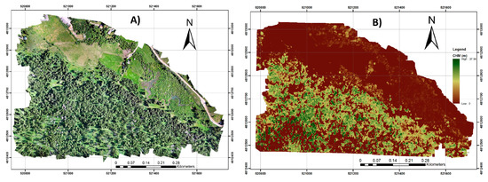 UAV-derived Orthomosaic (A) and Canopy Height Model (B).