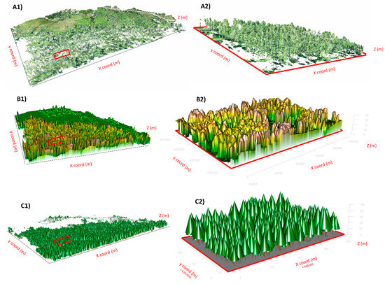 Illustration of individual tree detection at landscape (A1–C1) and plot (A2–C2) scales. (A1,A2) UAV-point cloud; (B1,B2) UAV-derived CHM; (C1,C2) Virtual forest in 3D.