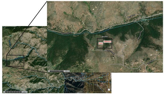 Samples were collected in the Fourmile Canyon, Boulder County, CO, USA. Samples were collected at 1 month (October 2010), 4 months (January 2011), and 29 months (June 2013) after a major, high-severity wildfire, which ignited on 6 September 2010. At all sample times, replicate samples were taken from both undisturbed (reference) forest soils and adjacent fire-disturbed (burned) soils. These sites were ~300 m apart and sampling areas fell within 650 m2 landscapes at similar slope-aspect (northeastern facing mountainside slope) and elevation (~2100–2300 meters above sea level) within the extent of the Fourmile Fire (latitude: 40.036153, longitude: −105.400537) (Figure 1). Sample areas were free of tree mortality from bark beetles and fungi. Prior to the burn, this contiguous study area had similar soil conditions across the landscape given consistent topographical and vegetative features (Figure 1). Metamorphic and igneous parent material has resulted in coarse, poorly developed, sandy soils in Fourmile Canyon []. Soils are stony sandy loams of the Fern Cliff-Allens Park-Rock outcrop complex as per National Cooperative Soil Survey (NCSS) classification. Annual precipitation averages 475 mm and occurs primarily as snow in winter/spring []. Both reference and burned sites were dominated by Pinus ponderosa var. scopulorum and Pseudotsuga menziesii var. glauca; details of location vegetation and fire history as well as the Fourmile Canyon Fire dynamics have been previously described [,]. Photos and maps of the fire’s extent and response to/control of the Fourmile Canyon Fire have been made available by the U.S. Department of Agriculture []. Trees in the burned site were severely burned (completely charred) and dead. Unlike the 1- and 4-month soils that were void of vegetation, 29-month soils were revegetated with understory herbaceous plants by seeding, dominated by sterile wheat.