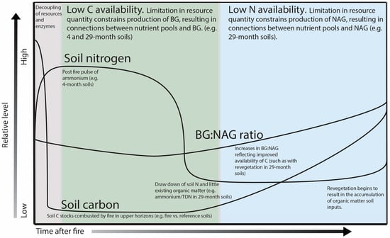 Altogether, our work leads to a conceptual model of patterns in the coupling of nutrients and decomposition enzyme activity on short timescales after fires (Figure 2). Because of characteristic changes in nutrient pools over the first years in post-fire succession, and the role of C and N availability as a control on enzyme production, we propose that the initial limitation in C availability results in a connection between BG activity and the resource environment. Likewise, in subsequent stages where C pools begin to build and N is more limited in availability (though C and N may be co-limiting), NAG activity shows connections with the resource environment (Figure 2). Here, in particular with plant colonization and the accumulation of C, BG:NAG ratios increase, reflecting improved availability of C substrates (Figure 2). It is important to note that these dynamics are envisioned for short timescales within the first years of succession, as N limitation alone across longer timescales can yield declines in BG:NAG ratio [] and more dramatic variation in other important controls such as pH and soil moisture may also become more influential.