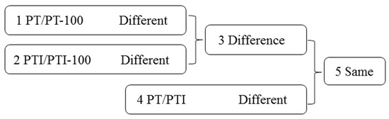 Comparison schemes of the four samples. PT represents the healthy wild-type sample of P. tomentosa, PTI represents the sample of phytoplasma infected PT. PT-100 represents the sample of 100 mg L−1 rifampicin treated PT, PTI-100 represents the sample of 100 mg L−1 rifampicin treated PTI. Different represents differentially expressed genes/long non-coding RNAs (lncRNAs). Difference represents the union of two groups, except their intersection. Same represents the intersection of two groups.