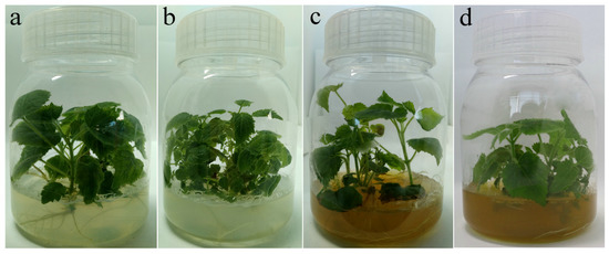 Rifampin treated plantlets morphology. (a) PT; (b) PTI; (c) PT-100; (d) PTI-100.
