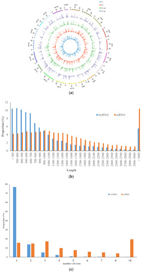 Characteristics of Paulownia lncRNAs. (a) Distribution of lncRNAs along each chromosome; (b) Transcript length distribution of lncRNAs and mRNAs; (c) Number of exons per transcripts for lncRNAs and mRNAs.