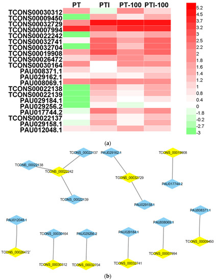 Characteristics of PaWB-related lncRNAs and mRNAs. (a) Expression profiling in PT, PTI PT-100, and PTI-100. The data were based on lg(FPKM); (b) LncRNA-mRNA networks. The blue polygons represent mRNAs, the yellow polygons represent lncRNAs. FPKM, fragments per kilobase of exon model per million mapped reads.