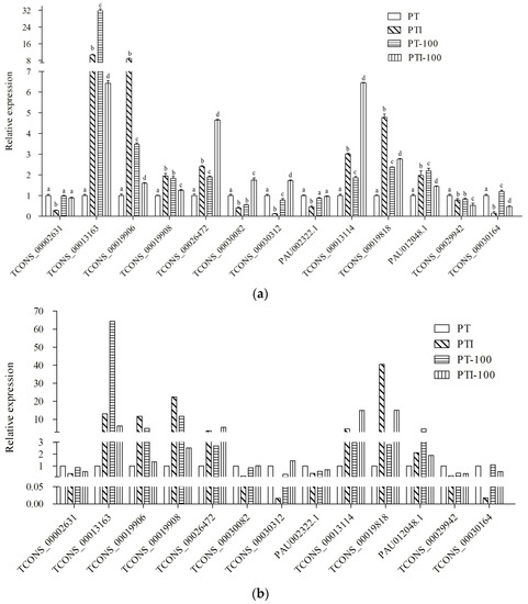 Expression pattern confirmation by qRT-PCR. (a) Changes in the relative expression levels as determined by qRT-PCR. Standard error of the mean for three technical replicates is represented by the error bars. Samples marked with various letters show a significant difference at p < 0.05; (b) Changes in the relative expression levels as determined by RNA-seq. The expression level of PT was set to 1.