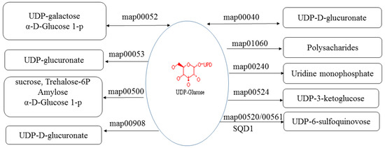 KEGG (Kyoto Encyclopedia of Genes and Genomes) pathways which UDP-glucose were involved in. map00052: Galactose metabolism; map00040: Pentose and glucuronate interconversions; map00053: Ascorbate and aldarate metabolism; map01060: Biosynthesis of plant secondary metabolites; map00240: Pyrimidine metabolism; map00500: Starch and sucrose metabolism; map00524: Neomycin, kanamycin and gentamicin biosynthesis; map00520: Amino sugar and nucleotide sugar metabolism; map00561: Glycerolipid metabolism; SQD1: UDP-sulfoquinovose synthase.