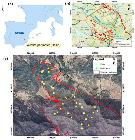 Maps of the study area and research site. The perimeter of the “Sierra de los Donceles” wildfire (a: in Spain, and b: in the municipality of Hellín), automatic weather station (Meteodata) and experimental plots (c) are represented on the maps. UTM coordinates, ETRS89.