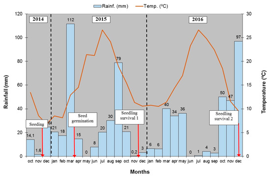 Climate diagram with the data recorded (research period October 2014–December 2016) at the weather station (Meteodata-3016C) in the experimental area. The diagram shows monthly precipitation (left ordinate, and bars) and average temperature (right ordinate, and line). Red arrows indicate the main observation dates: seeding, seed germination and two seedling inventories.