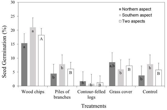 Mean values (±SE) of seed germination (untransformed units; %) depending on seeding method (treatment) and aspect for the study site. The bar chart shows the values for the two topographic aspects (pooled data) and within aspects (northern or southern aspects). For the two aspects, the means with the same capital letter were not significantly different, and the means within an aspect with the same lowercase letter were not significantly different (at the 0.05 level in all cases, according to the least significant difference (LSD) test). Sample data = 160 sub-plots (50 × 50 cm); 80 within each aspect.