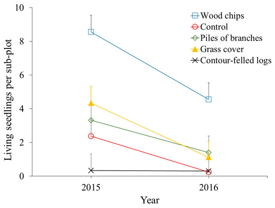 Interaction plot for the year × treatment factor. The means (±SE) of living seedlings per sub-plot after the summer (autumn 2015 and 2016) are represented in function of treatment (seeding method). Sample data = 160 sub-plots (50 × 50 cm). Total seeded sub-plots per treatment (seeding method) = 32.