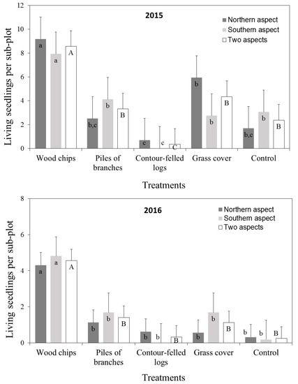 The results were similar analyzing seedling survival within the year (Table 3). The results in Figure 5 (using Fisher’s least significant difference LSD post hoc test; p < 0.05) show that a stronger response in seedling survival was observed in the seeding subjected to the wood chip cover (8.6 ± 1.3 living seedlings in 2015, and 4.6 ± 0.6 living seedlings in 2016), regardless of topographic aspect (pooled data). This treatment allowed more seedlings in the spot seeding to exist after summer than the control treatment (the seeding done on the bare ground; 2.4 ± 1.3 seedlings in 2015, and 0.2 ± 0.6 seedlings in 2016). In contrast, the seeding next to the contour-felled logs (on the shaded side) was the poorest treatment for promoting seedling survival (survival close to zero). At the second inventory (December 2016), the seeding with cover of wood chips showed significant differences of 3.2, 3.4, and 4.3 living seedlings compared to the seeding in piles of branches, next to grass and on contour-felled logs, respectively (for these treatments, the survival was very low in autumn 2016). When analyzing the within-aspect data, the obtained results were similar, and total seedling survival was significantly favored by covering the seeding with wood chips in both aspects and years.