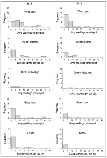 Frequency histograms for the living seedlings per sub-plot in each treatment (years 2015 and 2016). Each bar represents the number of sub-plots (frequency) in each class of “living seedlings” (class size = 5 seedlings).
