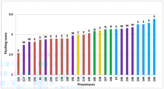 Predicted flushing of 26 provenances of subalpine fir, based on assessment in Thorsø, Hallormsstadur (spring 2001), Hønning and Vilsbøl (spring 2010), arranged from latest flushing (left) to the earliest (right). Regional division according to Hansen et al. [] is shown by colored bars and letters above bars (green/N = north, yellow/C = central, red/E = east, purple/W = west, blue/S = south).