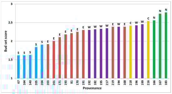 Predicted bud set of 26 provenances of subalpine fir, based on assessment in Thorsø and Hallormsstadur in the autumn of 2001, arranged from latest bud set (left) to the earliest (right). Regional division according to Hansen et al. [] is shown by colored bars and letters above bars (green/N = north, yellow/C = central, red/E = east, purple/W = west, blue/S = south).