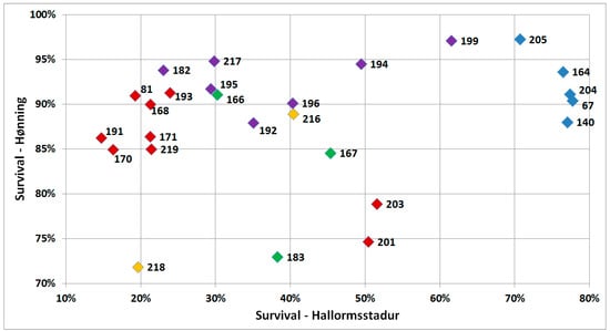 Predicted survival of various provenances in the field trial in Hønning (10 years after establishment) plotted against survival in Hallormsstadur (12 years after establishment). Regional division according to Hansen et al. [] is shown by colored symbols (Green = North, Yellow = Central, Red = East, Purple = West, Blue = South).