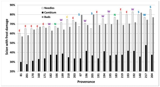 Per cent of scions collected in 2001 in Hallormsstadur, with induced frost damage on needles, cambium and buds at −16 °C in spring, for 23 provenances of subalpine fir. Provenances are sorted by their lowest mean predicted proportion of damaged scions (left) across all tissue types to the highest (right). Regional division according to Hansen et al. [] is shown by colored letters (green/N = north, yellow/C = central, red/E = east, purple/W = west, blue/S = south).