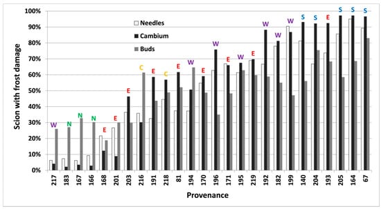 Per cent of scions collected in 2012 in Vilsbøl, with induced frost damage on needles, cambium and buds (at −24 °C, −24 °C and −18 °C, respectively) in autumn, for 26 provenances of subalpine fir. Provenances are sorted by their lowest mean predicted proportion of damaged scions (left) across all tissue types to the highest (right). Regional division according to Hansen et al. [] is shown by colored letters (green/N = north, yellow/C = central, red/E = east, purple/W = west, blue/S = south).