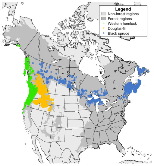 Trees identified as black spruce (Picea mariana (Mill.) BSP), interior Douglas-fir (Pseudotsuga menziesii var. glauca (Beissn.) Franco), or western hemlock (Tsuga heterophylla (Raf.) Sarg.) were compiled from databases provided by agencies in British Columbia, Alberta, Saskatchewan, Manitoba, Ontario, New Brunswick, Nova Scotia, Newfoundland and Labrador, and the United States (Figure 1).