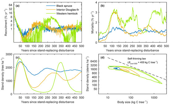 Incorporating these equations for recruitment, mortality, and aboveground biomass growth into a stand-level model reproduced the expected patterns in the population of trees in a single stand (Figure 2). Following a stand-replacing disturbance, the stand biomass density was very low, translating into high recruitment (Figure 2a) and relatively low mortality (Figure 2b). Stand density reached a maximum value between 37 and 50 years after disturbance (Figure 2c). After an initial recovery phase, the stands reached a stem-exclusion phase [62]. Following a period of stand breakup, the stand biomass density reached a threshold in which recruitment started to exceed mortality again, leading to a second generation of trees. In general, population dynamics conform to the expected relationship between tree size and stand density, or the self-thinning rule (Figure 2d). However, it is worth noting that none of the species precisely followed a linear function in the log-log space of tree size and stand density, as exemplified by the self-thinning boundary when Bave1000 was set to 400 kg C tree−1. It is also worth noting how the predicted curves changed slightly between the first and second generations of the simulations.