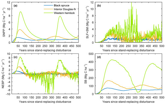 Single-stand biomass dynamics of black spruce, interior Douglas-fir, and western hemlock following natural regeneration from a stand-replacing disturbance: (a) stand-level net primary production (SNPP); (b) stand-level biomass turnover due to litterfall plus mortality (SLF + SM); (c) net ecosystem biomass production (NEBP); (d) stand-level biomass density (SB). yr, year.