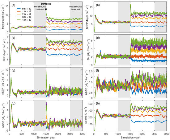 The perturbation in tree growth was hardwired into the code at the halfway point of each simulation (year 1500) by multiplying the prediction of tree growth from Equation (3) according to a stimulus factor, resulting in a step-change in tree growth between the first and second halves of the simulation. The effect of changes in tree growth on landscape-scale biomass dynamics was then assessed by calculating equilibrium responses for all stand-level variables output by the Sawtooth function. The equilibrium response was defined as the actual difference (or response ratio) between mean values of each variable during post-stimulus and pre-stimulus treatment periods. The pre-stimulus treatment period was defined from years 1000 to 1499 of the simulation, while the post-stimulus treatment period was defined from years 2501 to 3000 of the simulation, which safely allowed biomass dynamics to fully equilibrate following a change in boundary conditions. Two-sample t-tests were conducted to test for the significance of each response.