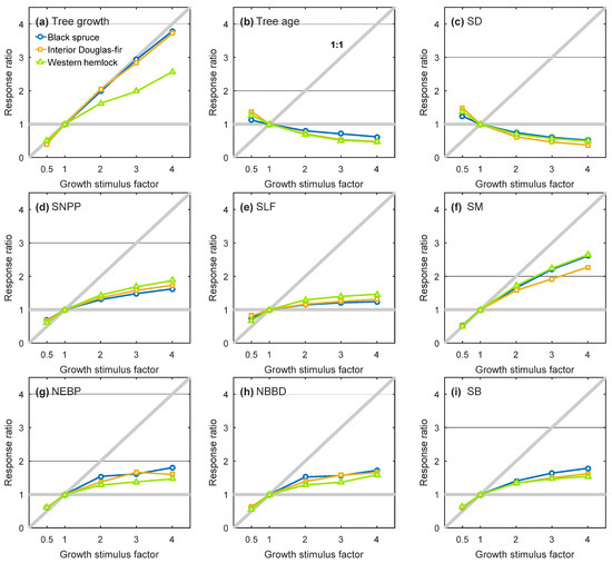 Scatterplots pairing each response ratio with each magnitude of tree growth stimulus never showed perfect 1:1 relationships (Figure 5). That is, regardless of the variable in question, the magnitude of relative response to varying perturbations in individual-tree growth was not linearly related to the magnitude of the growth stimulus factor. The only instances where the relationship came close to a 1:1 relationship was for the mean tree growth of black spruce and interior Douglas-fir (Figure 5a). It is counterintuitive prima facie that the response in landscape-average tree growth did not scale perfectly with the imposed growth stimulus factor. This decoupling demonstrates the dynamic nature of the models. For example, if the stimulus factor that is applied to growth consistently increases the size of the tree and growth eventually decreases with size, then the perturbation in growth will become less influential (Equation (3)). The magnitude of decoupling appeared to be minor for black spruce and interior Douglas-fir, but substantial for western hemlock. For example, imposing a 300% perturbation in tree growth only translated into a 168% increase in landscape-scale tree growth of western hemlock.