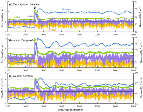 A close-up look at the response of each species to the doubling in tree growth illustrated the transient nature of the response of net ecosystem biomass production (Figure 6). Much like the first regeneration cycle of any model simulation, the uniform change in growth rates across entire landscapes triggered low-frequency dynamics that dissipated over centuries, although they appeared highly muted in the less-productive black spruce simulations. In general, the stimulus was followed by phases of aggradation, transition, and finally steady state [63]. The responses closely resembled a general class of “growth with limited overshoot followed by stabilization” [64]. Although the broad perspective given by Figure 6 made the transition phase look weak, it is easy to see how the unique high magnitude and transient nature of stand biomass densities achieved during the first aggradation and transition sequence could have important impacts on the forest sector. The positive response of net ecosystem biomass production terminates at years ranging from 50 to 95 years after the perturbation in interior Douglas-fir and western hemlock, respectively.