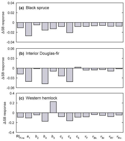 All tested model parameters contributed to the magnitude of the decoupling of stand biomass from perturbations in tree growth according to sensitivity analysis (Figure 7). In black spruce, increasing the return-interval of stand-replacing fire by 25% led to a decrease in the positive response of stand biomass from the actual response of 41% (Table 5) to 40% (ΔSB = −0. 009 in Figure 7a). Similar sensitivities were expressed by interior Douglas-fir (Figure 7b) and western hemlock (Figure 7c). A 25% intensification in the negative dependence of recruitment on stand biomass (a1 in Table 2) similarly decreased the response of stand biomass in all species. Likewise, a 25% intensification in the positive dependence of mortality on the biomass of larger trees (b4 in Table 3), or the negative dependence of growth on the biomass of larger trees (c4 in in Table 3), consistently decreased the response of stand biomass. The additional consideration of an absolute measure of stand competition on mortality was almost as influential, although we acknowledge the counter-intuitive direction of the relationship for western hemlock mortality, which translated into an increase in the forest biomass response to growth enhancement (Figure 7c). Increasing biomass turnover rates by 25% consistently led to decreases in the forest biomass response to growth enhancement in all species, with a slightly greater influence of foliage and fine-root turnover parameters.