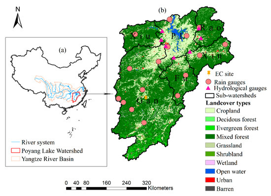 (a) Location of the Poyang Lake watershed in China; (b) The land-cover types in 2001 from the Moderate Resolution Imaging Spectroradiometer (MODIS) product, the distribution of hydro-meteorological gauges, the location of the eddy covariance (EC) flux site in Qianyanzhou (marked in saffron yellow), and the five main river sub-watersheds (including the Gan River (Gan), Fu River (Fu), Xin River (Xin), Rao River (Rao), and Xiu River (Xiu)) and the Poyang Lake area (PL) in the Poyang Lake watershed.