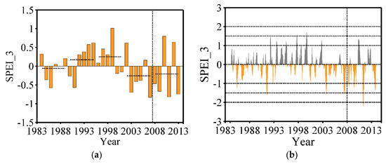 According to the drought standard in Table S1, droughts of various categories were identified according to area-averaged SPEI_3 in the Poyang Lake watershed during the growing seasons of 1984–2013 (Figure 2b). Moderate drought occurred nine times during 1984–2013, with the 2008–2013 period having the most. From 2008 to 2013, moderate drought occurred throughout the entire growing season in 2009, while moderate drought occurred late in the growing season in 2013. Severe drought occurred just three times before 2008. In contrast, extreme drought occurred just one time during the growing seasons from 1984–2013: during the early growing season of 2011. This indicates that drought duration was prolonged and that drought intensity increased from 2008 to 2013, especially in the growing seasons of 2009, 2011, and 2013.