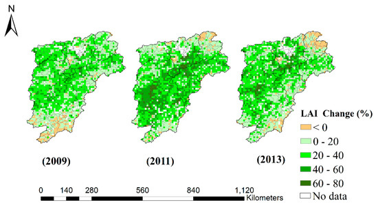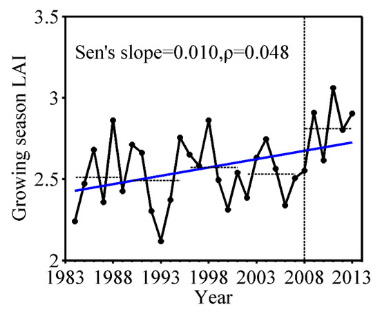 The trend of vegetation greenness for the Poyang Lake watershed was examined using the growing season LAI during the period from 1984 to 2013 (Figure 3). The watershed-averaged vegetation greenness as characterized by growing season LAI exhibited a significant increasing trend (ρ < 0.05) from 1984 to 2013, with one period of sharp increase: 2008–2013 (Figure 3). Vegetation restoration was most extensive in the period between 2008 and 2013, due to Mountain-River-Lake watershed management programme and the “Grain for Green” project in the study watershed [22,23].