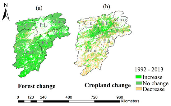 (a) Changes in forest cover (2013 versus 1992); (b) Changes in cropland cover (2013 versus 1992).