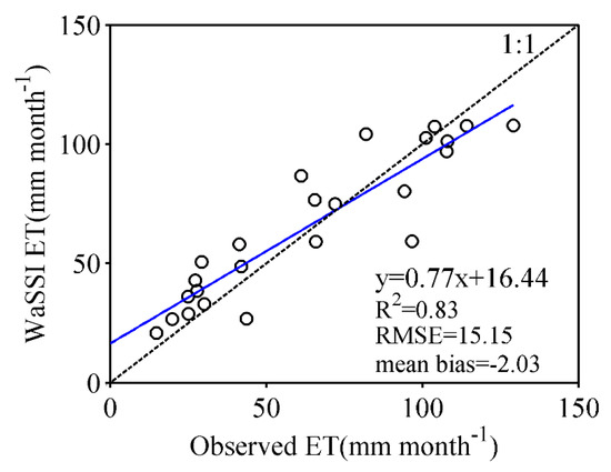 The scatter plot of the measured actual ET vs. modelled actual ET (2003–2004) provides evidence for the capability of the modified WaSSI model to simulate actual ET (Figure 6). The modelled actual ET was related to the observed actual ET with a coefficient of determination (R2) of 0.83. Moreover, the observed and the modelled actual ET were distributed along the 1:1 line with a mean bias of −2.03 mm month−1 and a root mean square error (RMSE) of 15.15 mm month−1.