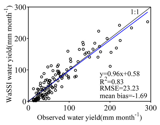 Comparisons between the modeled water yield and observed water yield for the Poyang Lake watershed from 2000 to 2010 (Figure 7) indicated that the modified WaSSI model performed well as judged by the model statistics (R2 = 0.83; RMSE = 23.23 mm month−1). The mean bias of the modelled water yield was −1.69 mm month−1, suggesting that the model slightly underestimated water yield in this watershed. This result is reasonable as the model failed to consider the effect of dams on water yield. Overall, the model simulated the monthly water yield well.