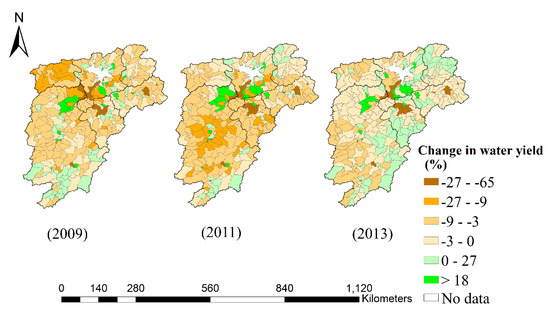 However, in most areas with increases in vegetation greenness, an increase of 20–80% in vegetation greenness generally led to a reduction of 3–27% in water yield under different intensities of drought (Figure 4 and Figure 8). A large decrease in water yield (9–27%) was observed in the middle reaches of the Xiu River with large increased forest greenness (20–60%) during the long-duration moderate drought (the growing season of 2009). During the short-duration moderate drought (the growing season of 2013), a reduction of less than 9% in water yield was observed in most areas with increased vegetation greenness. A large reduction in water yield (3–9%) was mainly observed in the upper and middle reaches of the Gan River with an increase of 20–60% in forest greenness. Furthermore, during an extreme drought, a large reduction in water yield (9–27%) was observed in the middle and the upper reaches of the Gan River with a large increase in forest greenness (40–80%) during the growing season of 2011. This indicated that increased vegetation greenness may lead to a greater reduction in water yield under a long-duration moderate drought or a short-duration extreme drought.