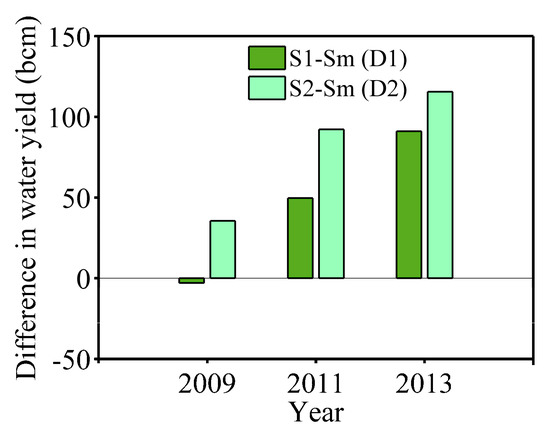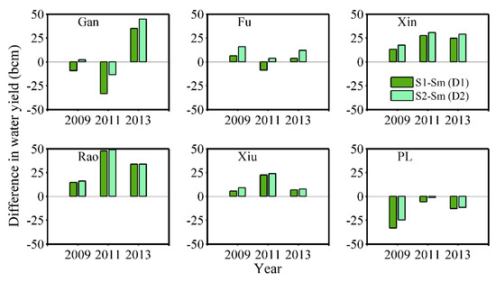 To assess conflicting demands for water between ecosystems and humans resulting from increased vegetation greenness, a comparison of maximum water demand by socio-economic systems (Sm), water yield in S1 (real change in vegetation greenness) and S2 (unchanged vegetation greenness) was explored for the Poyang Lake watershed and six sub watersheds of different intensities of drought (Figure 9 and Figure 10). On the one hand, when the difference between S1 and Sm (D1) is less than zero and the difference between S2 and Sm (D2) is greater than zero, increased vegetation greenness may cause conflicting demands for water between ecosystems and humans. In addition, if the D1 and D2 are both less than zero and the D1 is less than D2, increased vegetation greenness may aggravate conflicting demands for water between ecosystems and humans.
