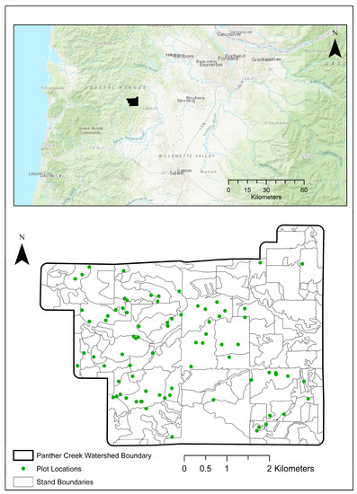 The study was conducted at the Panther Creek watershed, Oregon (Figure 1). The Panther Creek study area is an approximately 2580-hectare forested watershed on the east side of the coastal mountain range of Oregon, USA. It is located 57 km southeast of Portland, Oregon, USA at 45°18′ N, 123°21′ W [3]. The elevation ranges from 100 m to 700 m. Annual precipitation is about 150 cm. The forests are mainly planted or natural stands of Douglas fir, with significant amounts of western hemlock, western red cedar, grand fir, red alder, bigleaf maple, and several other species. Tree heights are up to 60 m [3]. Management intensity throughout the watershed has been variable, with varying planting densities, and both thinned and unthinned regimes. The ecoregion classification is “Cascade mixed forest” [18].