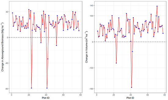 Except for five plots for AGB and three plots for CVTS, all other plots exhibited positive change, i.e., there was an increase in both volume and biomass in 73 out of 78 plots between the year 2007 and 2012 (Figure 2). Interestingly, there were two plots in which the CVTS per hectare was increased but AGB was decreased from year 2007 to 2012. This could be because the AGB equations were a function of DBH only and the CVTS was a function of DBH and height. These five plots were tested for possible outliers using the median absolute deviation (MAD) statistics calculated as follows (Leys et al. [23]):