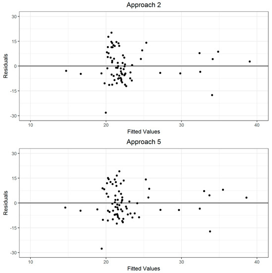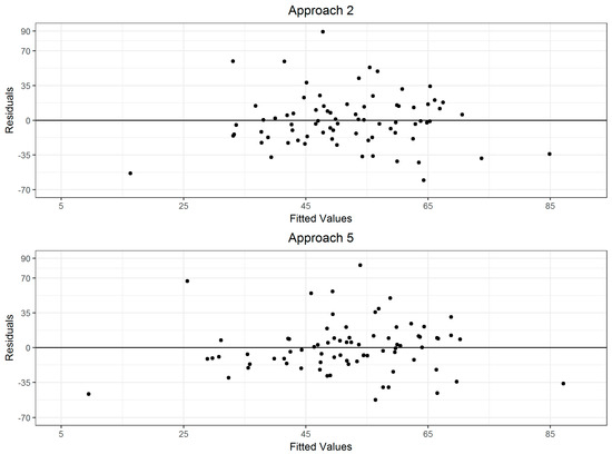 Plots of fitted values vs. residuals obtained in modeling change in volume (m3 ha−1) using change in lidar metrics using fixed (Approach 2) and mixed (Approach 5) effects models.