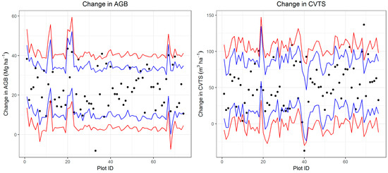 Prediction intervals obtained from Approach 2 (red) and Approach 5 (blue) in estimating change in aboveground biomass and cubic volume. Black points are the observed values of change in AGB and CVTS from 2007 to 2012.