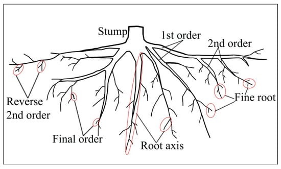 Each sampled tree was divided into the following components: roots, stem, branches, and leaves. For determination of belowground biomass, the nested regression method was applied [26,27]. Roots protruding from the stump were defined as first order, and those branching from the first order as second order (Figure 1), and the same manner for the rest. Final-order root and root branches, removing all lateral roots, were referred to as the single main root branch, namely, the root axis (Figure 1). As such, a root branch is composed of a series of root axes of all orders. Accordingly, the root axis was treated as a full cone-like minor tree bole for volume calculation. To facilitate measurement and ensure accuracy, root axes with a diameter larger than 2 mm were sectioned into segments of 30 cm in length, otherwise the segment was 10 mm. Diameters at both ends of a section were measured. Equations (1) and (2) were used for calculating the volume (V) and surface area (S) of root axes, respectively,
