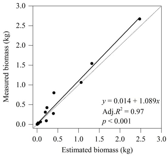 Because measuring fine root biomass in the field is difficult and impractical, the reliability of the nested regression method in biomass measurement and calculation was assessed by validating the root branch biomass model through a validation dataset. As displayed in Figure 2, the linear regression analysis showed that estimated and measured values were highly correlated, with Adj. R2 = 0.97. In addition, a paired samples t-test under the significance level of 0.05 suggested that there was no significant difference between simulated and observed values (p = 0.15).