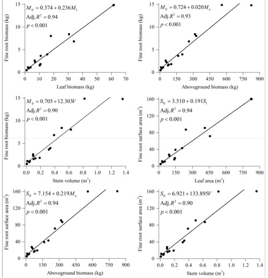 There were highly significant (p < 0.001) positive linear correlations between biomass and surface area of fine roots and those of leaves for individual trees, with Adj. R2 = 0.94 for both equations (Figure 3). In addition, strong positive linear relationships were observed between biomass and surface area of fine roots and aboveground production (biomass and stem volume) (Adj. R2 ranging from 0.90 to 0.94). The linear regression between fine root biomass and aboveground biomass indicated that fine root biomass was approximately 2% of aboveground biomass.