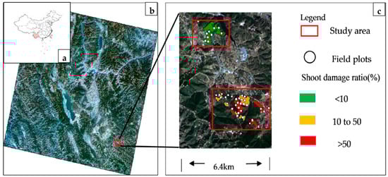 Forty permanent field plots (30 m × 30 m) were set up in 2016 and distributed as evenly as possible over the study area (see Figure 1c). The geographic coordinates for all plots were measured using differential GPS. At each plot, we sampled all trees with a diameter at breast height (DBH) greater than 4 cm. Three major parameters were measured including DBH, height (H), and the shoot damage ratio (SDR) of each tree. The plot SDR was the averaged shoot damage ratio of single trees (pi). The average equally treats all trees without considering tree size with regards to weight. The plot size of 30 m × 30 m was to match the spatial resolution of Landsat images.