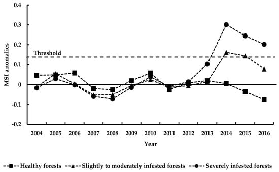 Examples of temporal pixel trajectories representing MSI anomalies from the healthy forests, slightly to moderately infested forests, and severely infested forests. Dash straight line represents the threshold value (MSI anomalies = 0.13).