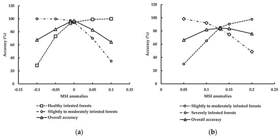 Overall accuracy, healthy forest class accuracy, slightly to moderately infested forest class accuracy, and severely infested forest class accuracy from confusion matrices with different MSI threshold values used to (a) separate the healthy class from the slightly to moderately infested class and to (b) separate the slightly to moderately infested forest class from the severely infested class.