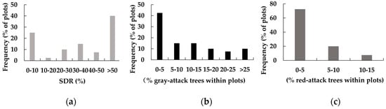 (a) The frequency of shoot damage ratios within plots; (b) The frequency of gray-attack trees within plots; (c) The frequency of red-attack trees within plots.