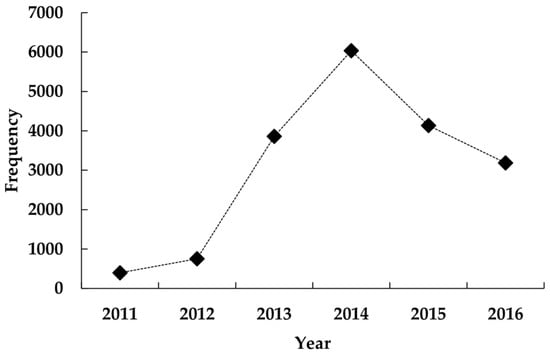 The frequency distribution of severely infested pixels within 30 m resolution of pixels generated from MSI threshold values is shown in Figure 5. The number of severely infested pixels show an abrupt jump from 2012 to 2013, which indicates a beetle outbreak in 2013. Based on the records of the local forestry station, the Yunnan pine suffered from serious shoot beetle damage in 2013. The outbreak area increased and reached its peak in 2014, then subsequently declined.