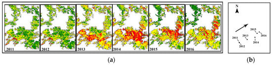 (a) The damage locations from 2011 to 2016 were speculated using the MSI threshold values (green corresponds to healthy forests, yellow corresponds to slightly to moderately infested forests, and red corresponds to severely infested forests); (b) The median center from 2011 to 2016 was calculated using ARCGIS.