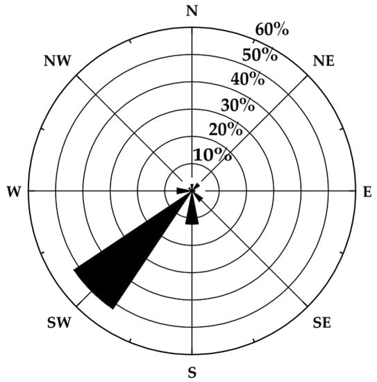 Beetle damage maps based on MSI threshold values from 2011 to 2016 are shown in Figure 6a. The movement of the outbreak center is shown in Figure 6b. We found that from 2011 to 2016, the centers of severely infested forests have a significant trend going from a southwest to northeast direction. Furthermore, the southwest wind direction is the dominant wind direction in Pupeng Town (Figure 7), and it seems that wind direction may affect the moving direction of the beetles.